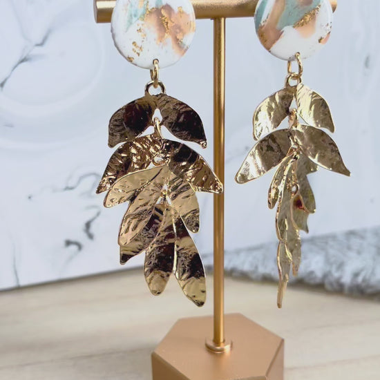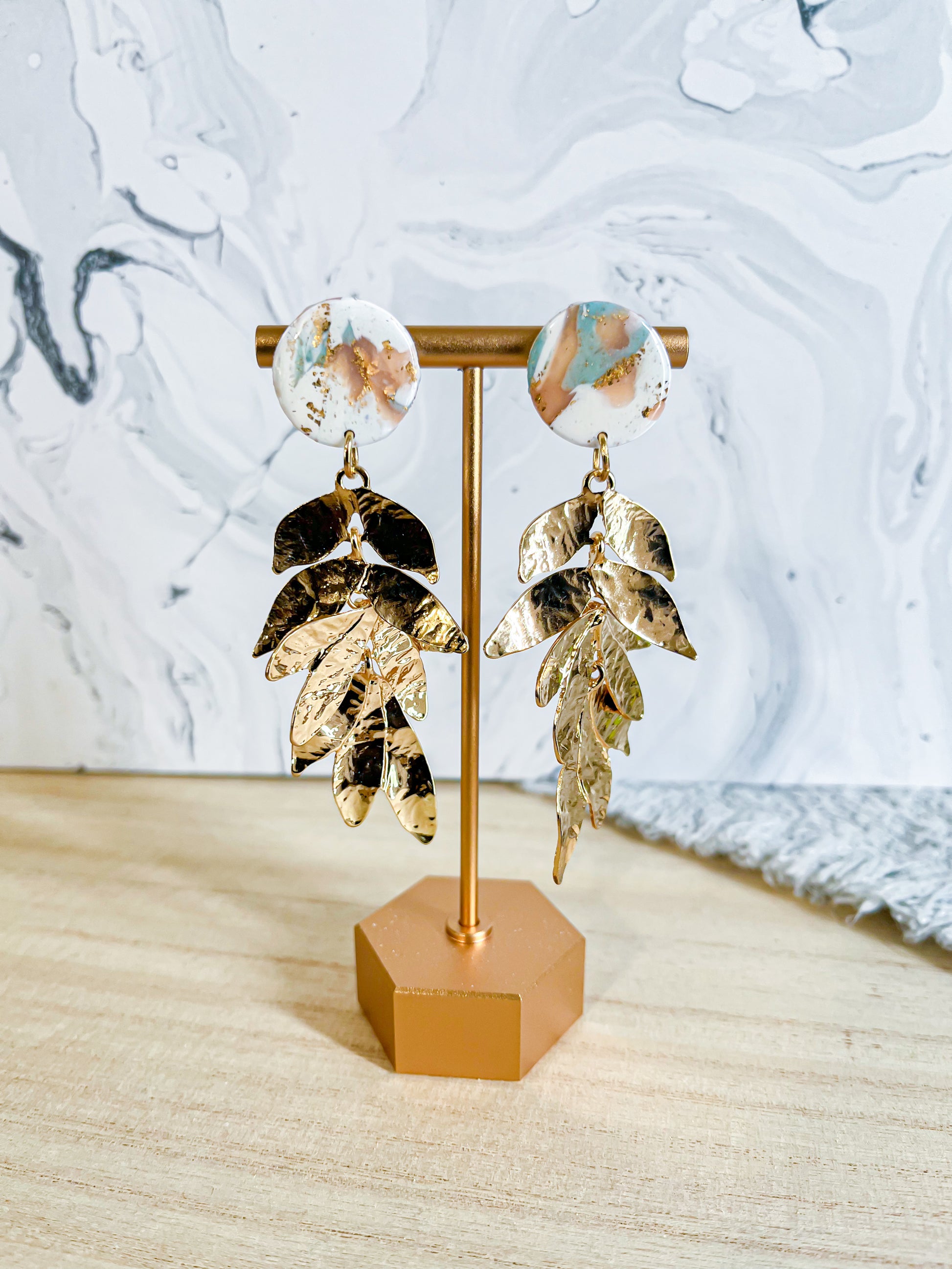 These elegant earrings feature a handcrafted clay stud with soft swirls of earthy tones and gold accents, paired with cascading metallic gold leaves for a bold yet sophisticated look. Eye-catching, they’re the perfect accessory to elevate any outfit from day to night.