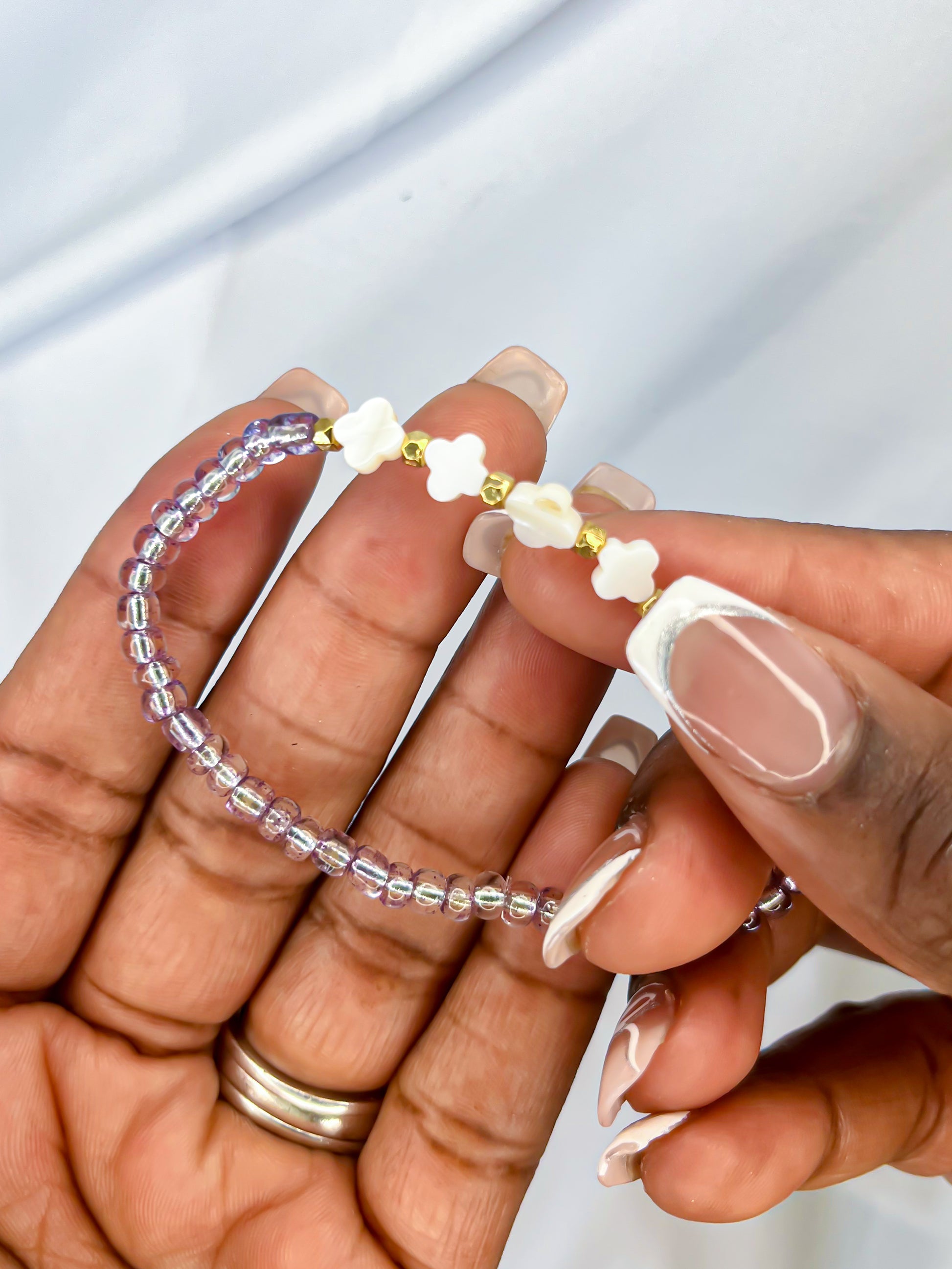 Enhance your outfit with our Purple Clover Stretch Bracelet. The shiny white clover beads contrast beautifully with the sheer purple beaded stretch design.